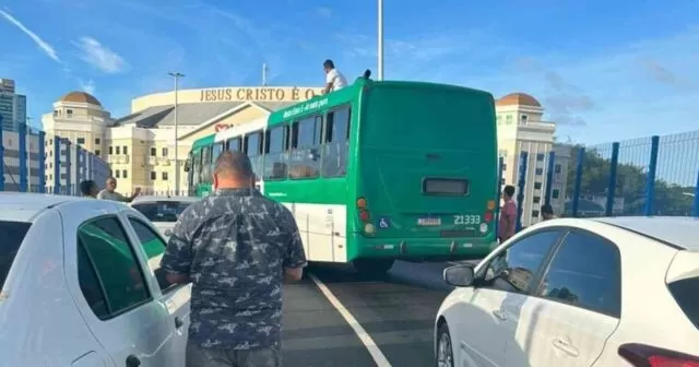 Rodoviário sobe no teto de ônibus após ‘surto’ e paralisa trânsito no Viaduto Raul Seixas